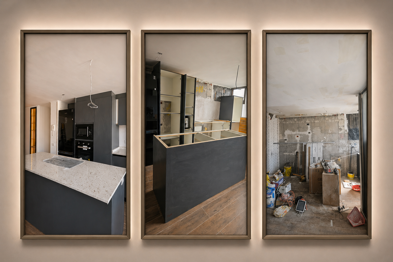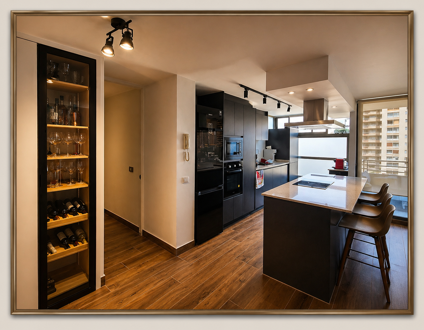 Remodelación de cocina a medida, diseñada para optimizar el espacio y lograr una estética limpia y contemporánea. Integramos mobiliario en tonos oscuros con cubierta clara, una isla central funcional para el uso diario y una cava iluminada que aporta diseño y personalidad al ambiente.